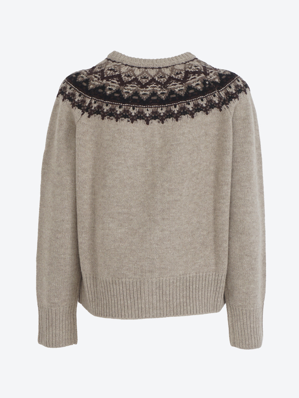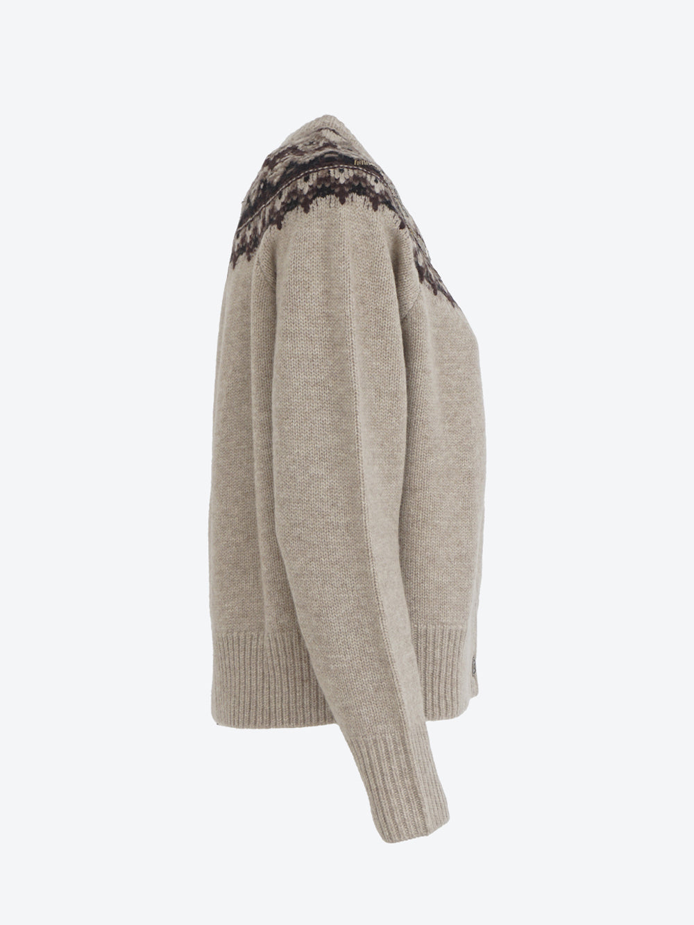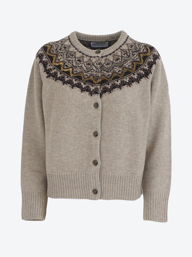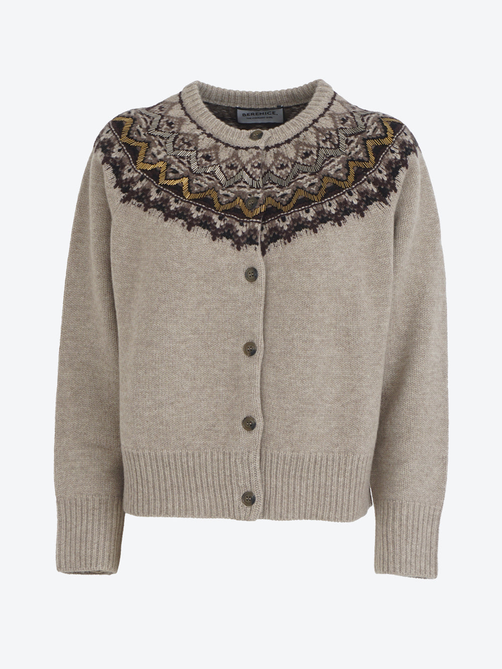 Cardigan MAMBOWAVY si distingue per l' elegante scollo rotondo, impreziosito da un raffinato jacquard e da un delicato ricamo di perle intorno al collo.