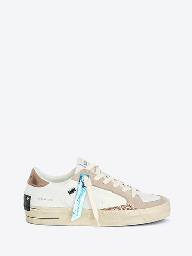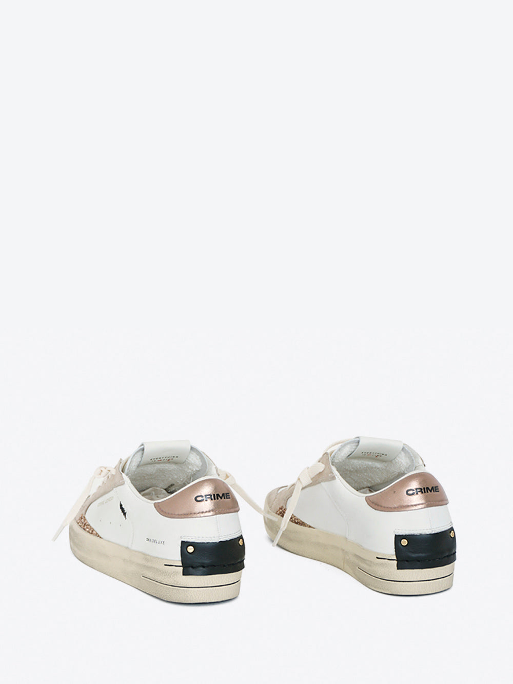 • Tomaia in pelle bianca, pelle scamosciata beige e glitter oro