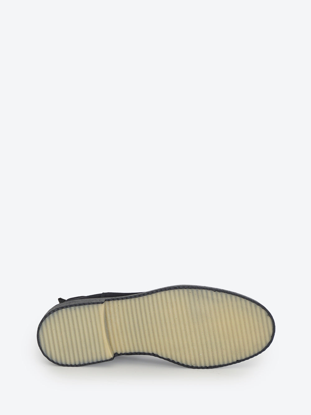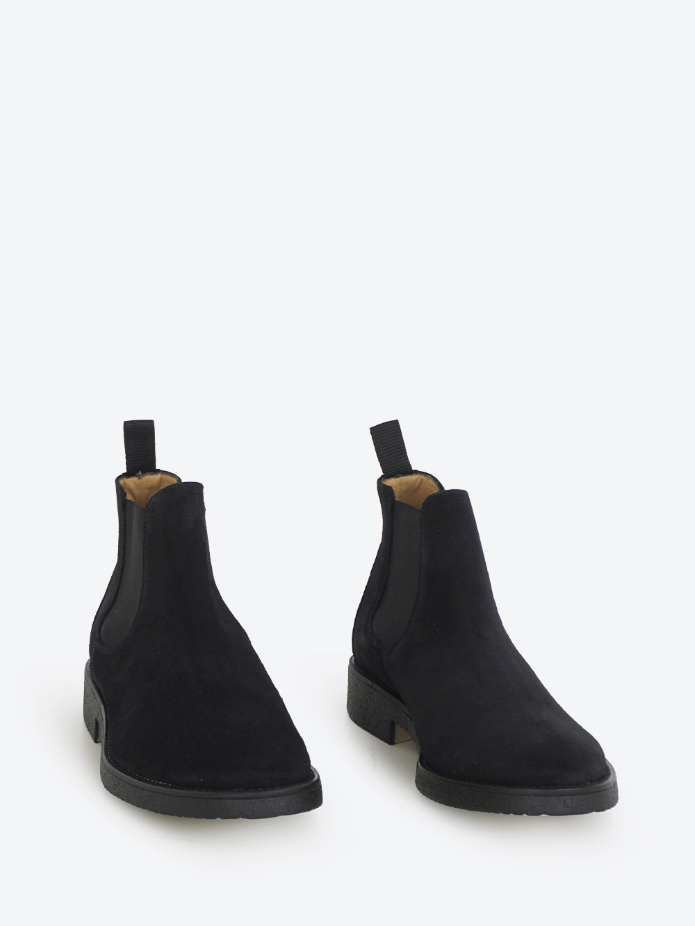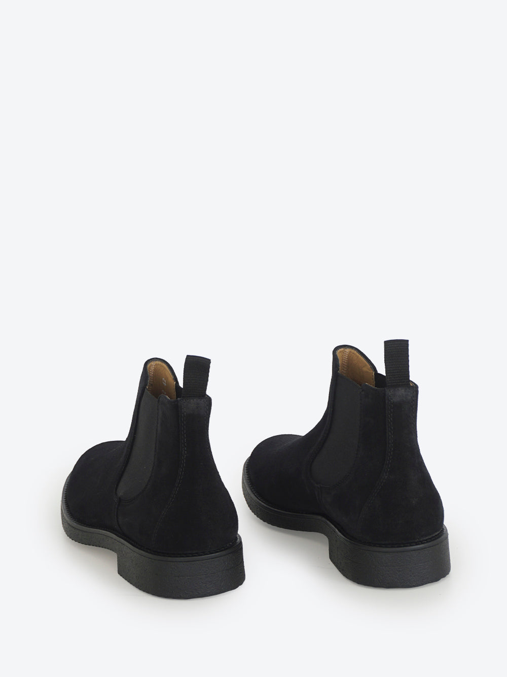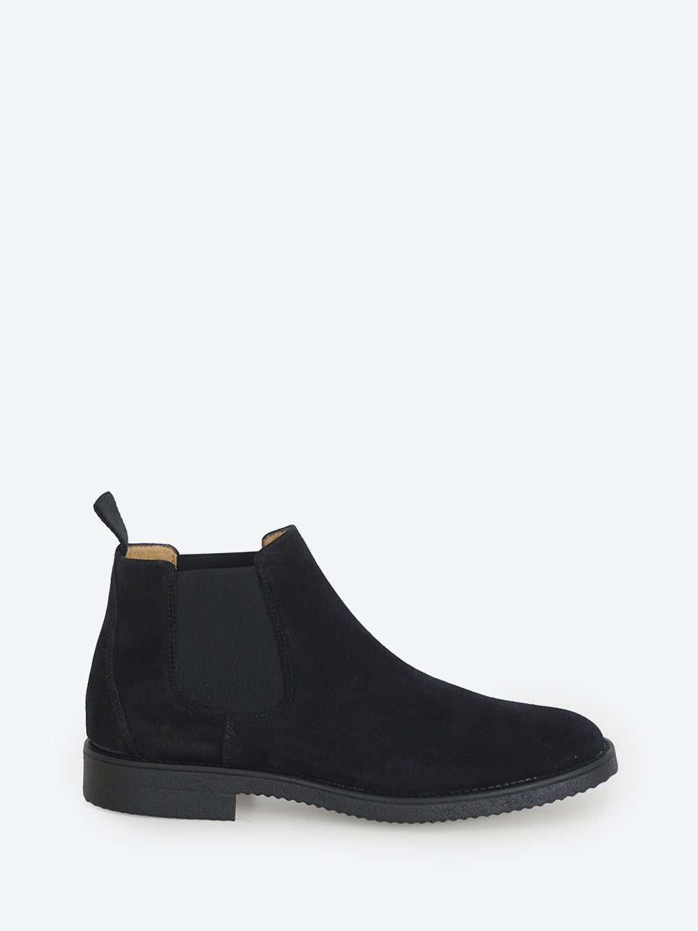 Stivaletti chelsea in pelle di vitello scamosciata, presenta elastici laterali in tinta dal design classico e raffinato.