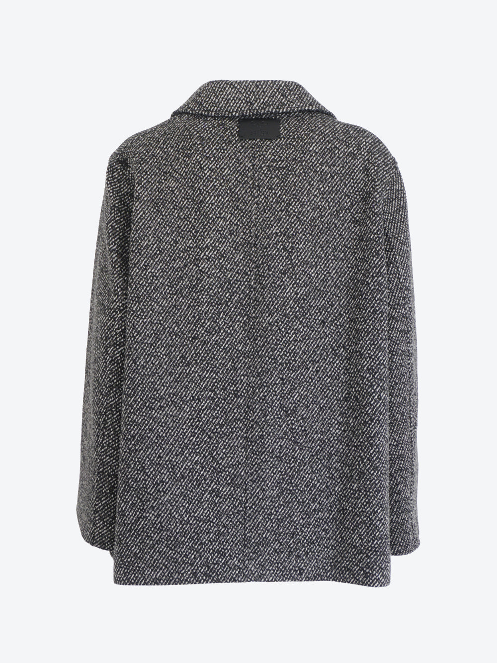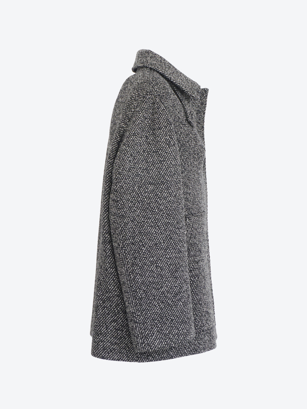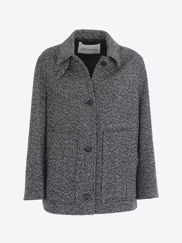 Cappotto corto è realizzato in twill di misto lana testurizzato con filati mouliné bicolore e 60% lana riciclata.