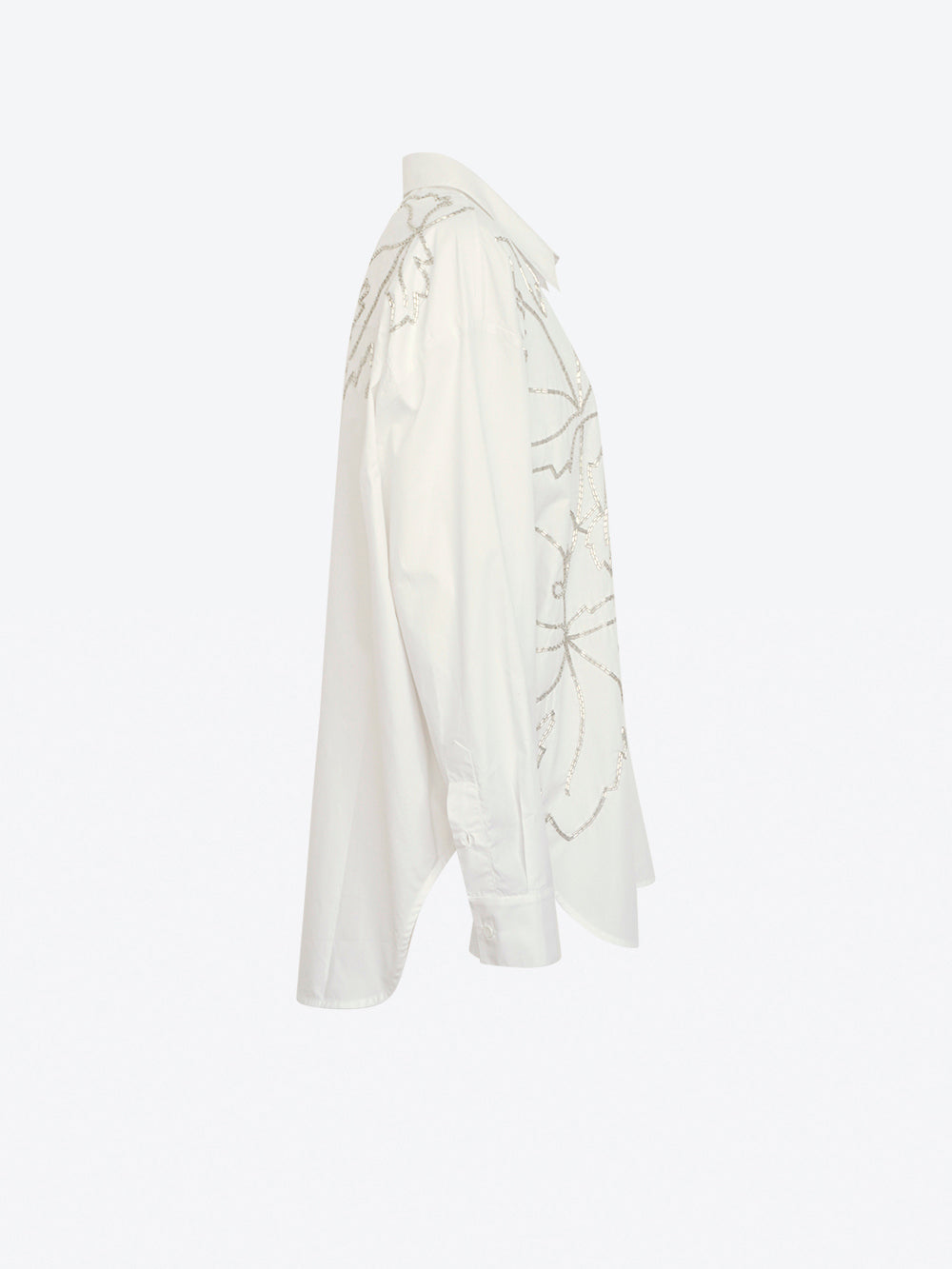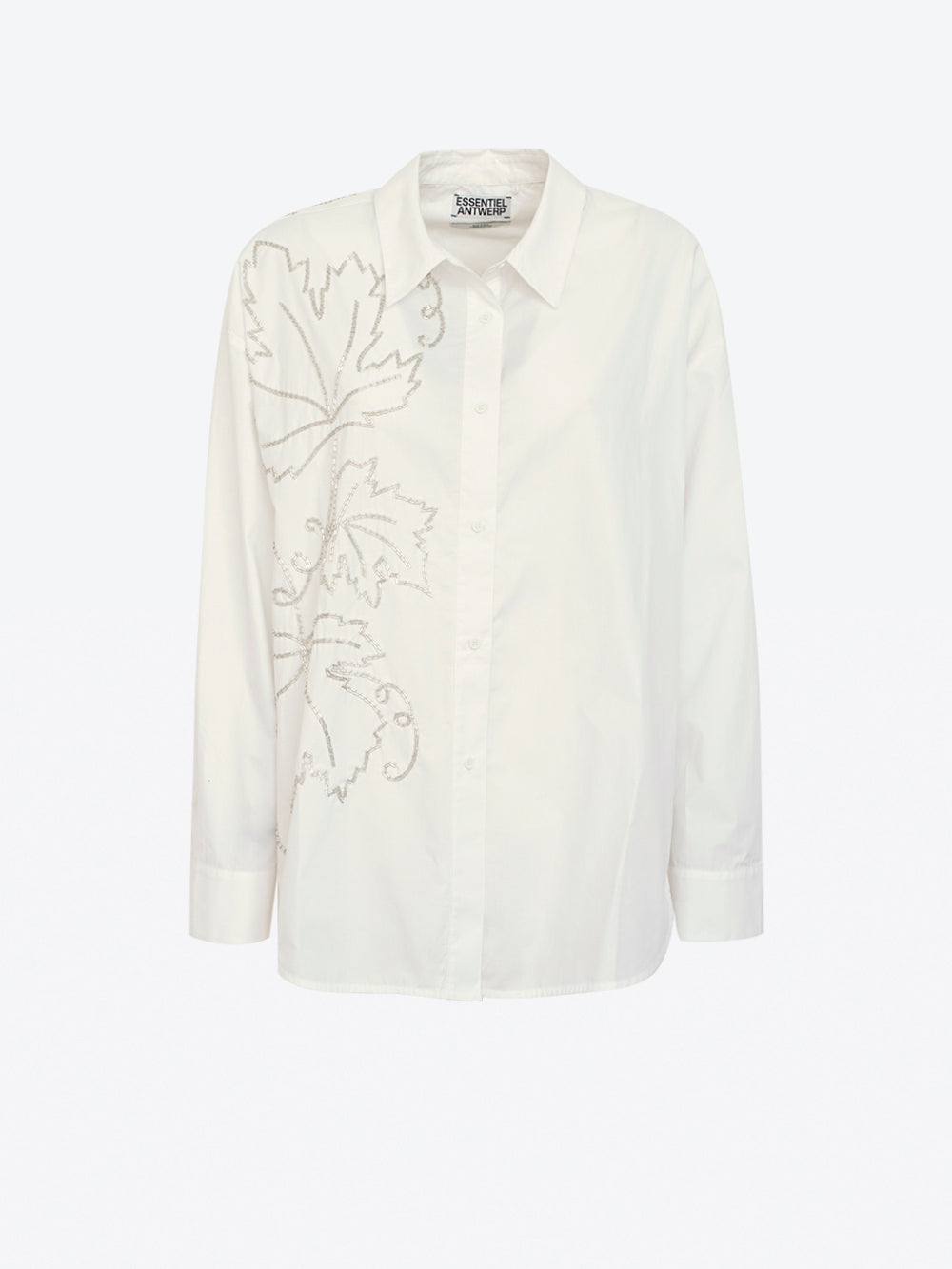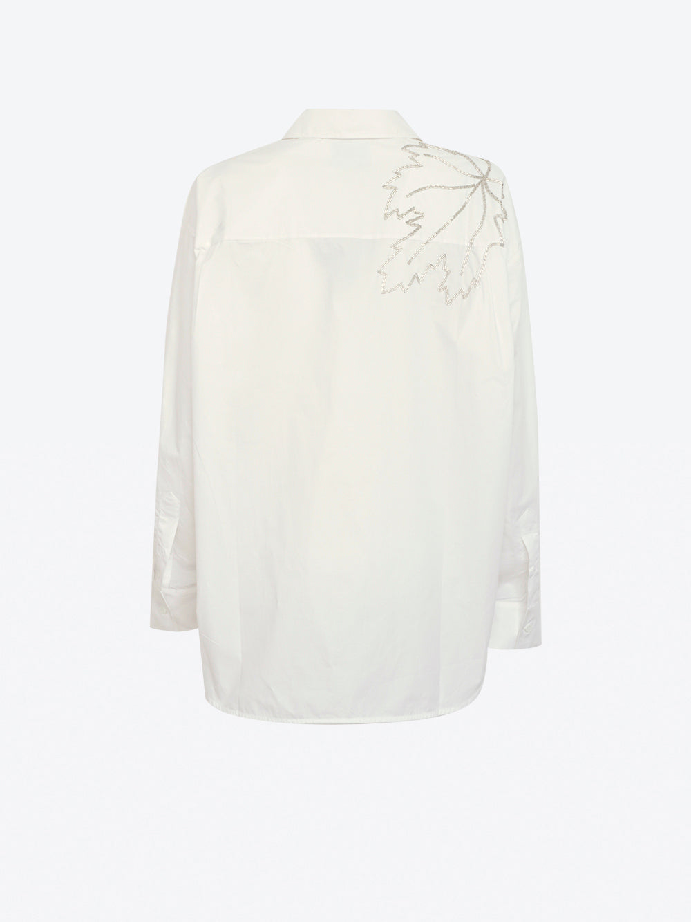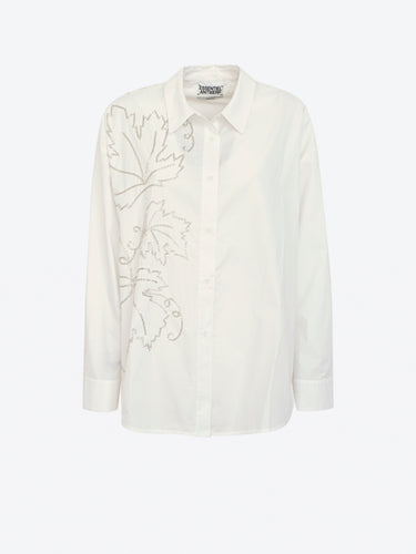 Realizzata in cotone fresco, questa camicia è impreziosita da un ricamo di perline che traccia un ampio motivo di foglie di vite sul davanti.