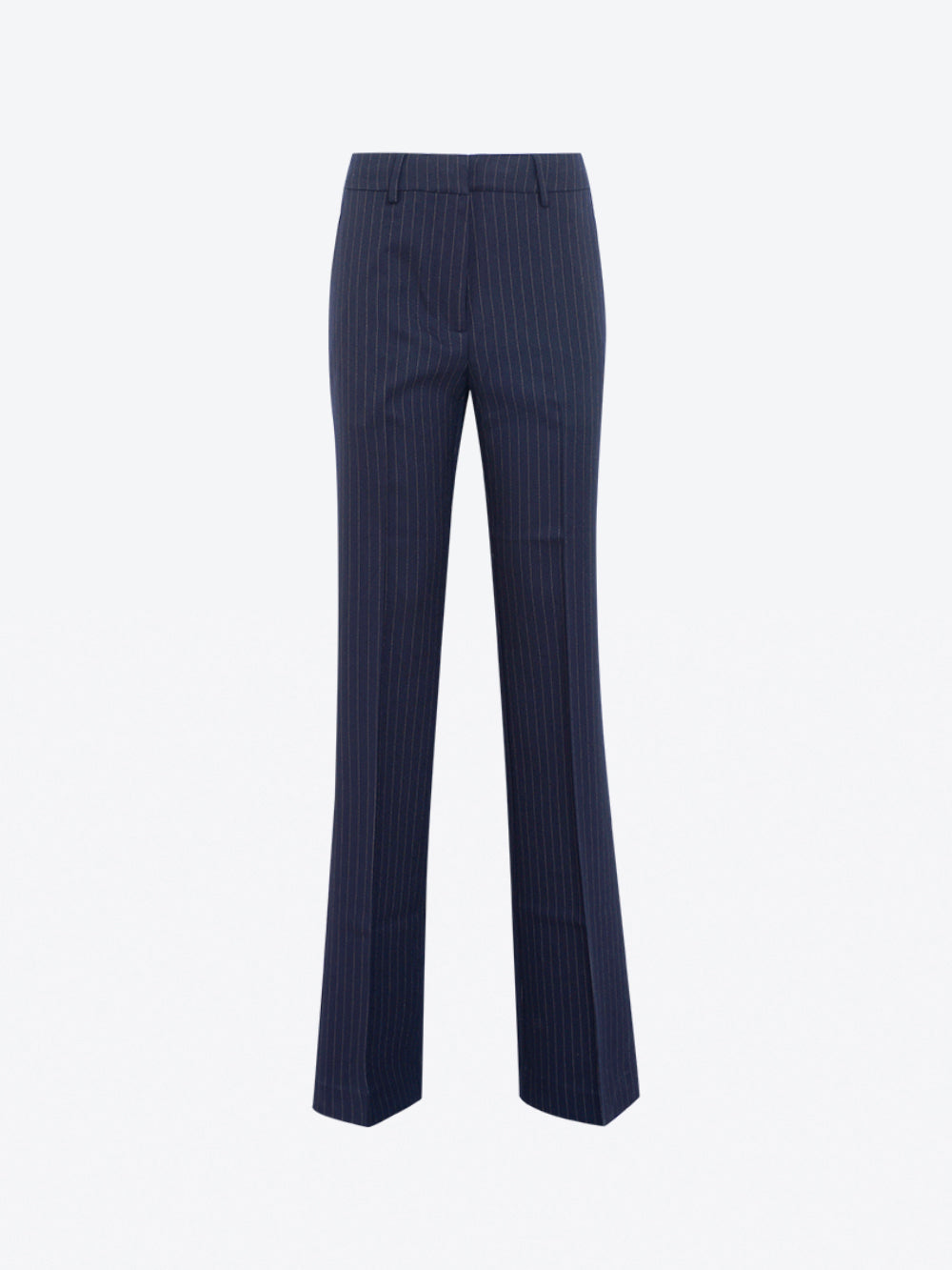 Pantaloni a vita alta e gamba svasata vestono aderenti sui fianchi e si allargano poi in un'elegante svasatura.